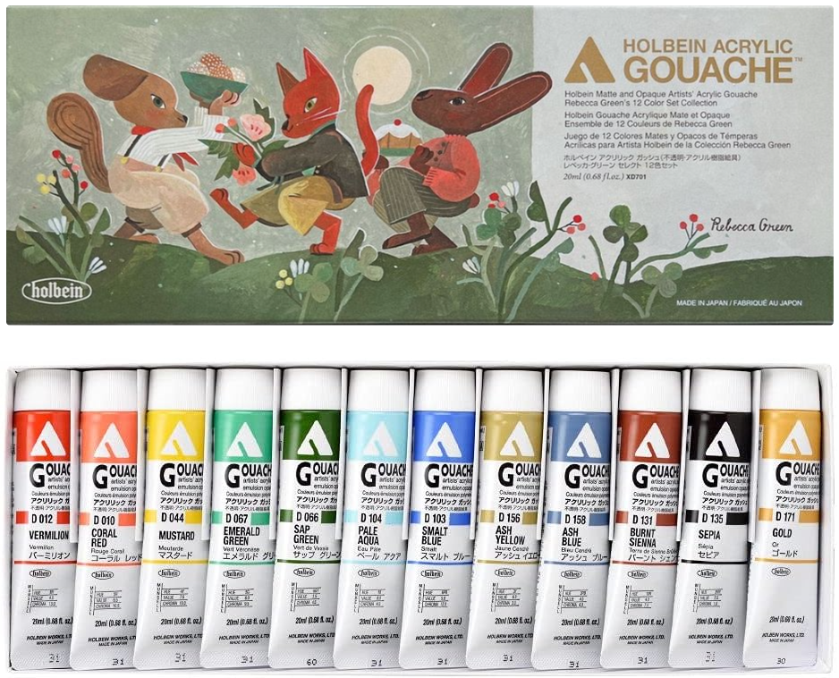 Expand your creative arsenal with Rebecca Green's 12-Color Acrylic Gouache Set crafted with care by Holbein Artist Materials in Osaka, Japan! This exclusive, professional-grade paint set features 12 beautiful colors hand-picked by renowned artist Rebecca Green. This collection is perfect for illustrators and creators looking to elevate their craft.