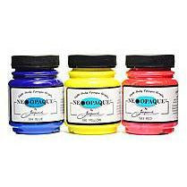 Neopaque Colors can be painted, stenciled, screen printed, airbrushed (when diluted), and stamped. The colors apply easily and smoothly and adhere to untreated fabrics and supports – wood, canvas, paper, and natural or synthetic fabrics from lightweight silk to denim and leather.
