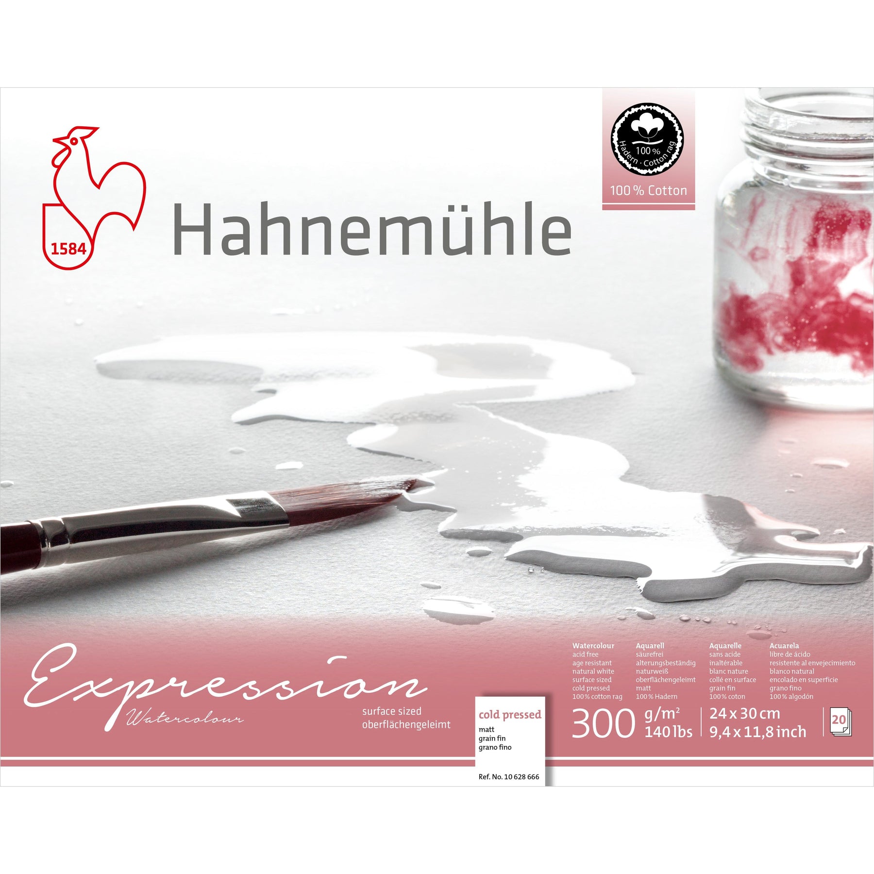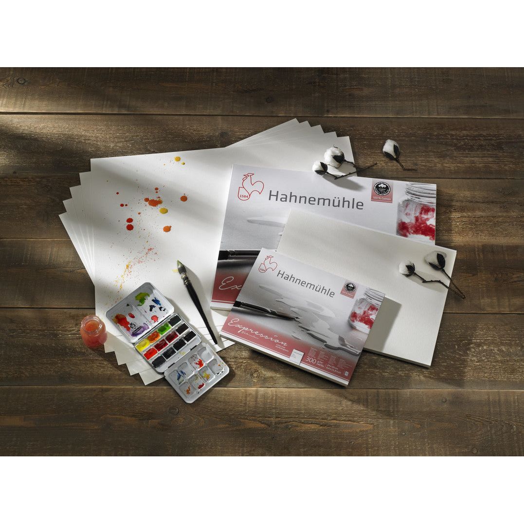 Expression Watercolor – the natural-white 100-percent cotton, surfaced sized paper, is suitable for all wet-painting techniques and etching. Expression Watercolor features surface sizing. Colors stand out excellently on the paper and impress with their natural brilliance, thus giving every subject its very own, unique presence. Masking fluids or masking tape can be used and removed residue-free. While wet colors can be easily corrected or taken off.