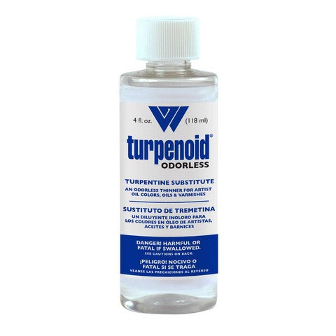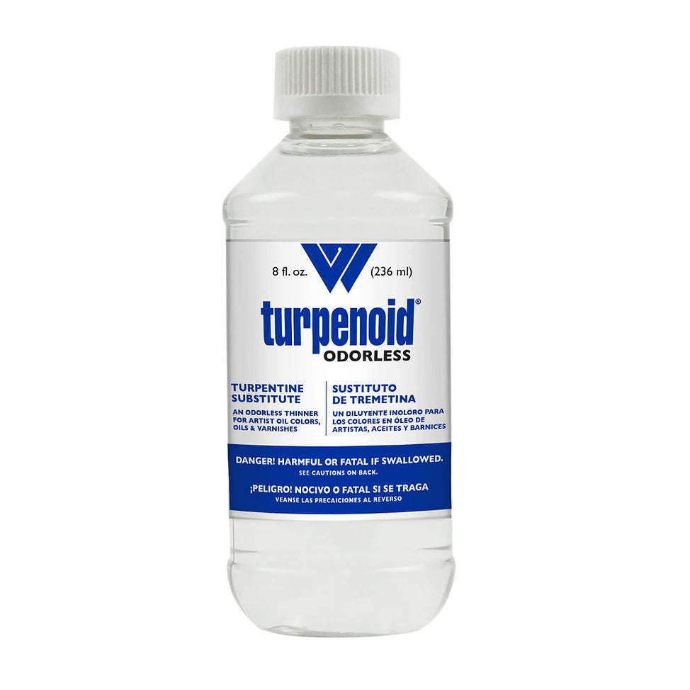 Turpenoid® Odorless is the first turpentine substitute and favored by generations of oil painters.  It has the same painting properties and drying time as turpentine yet is free from the strong and characteristic odor. Turpenoid is a highly refined, water-clear mixture of petroleum distillates compatible with oil and alkyd paints without affecting color.