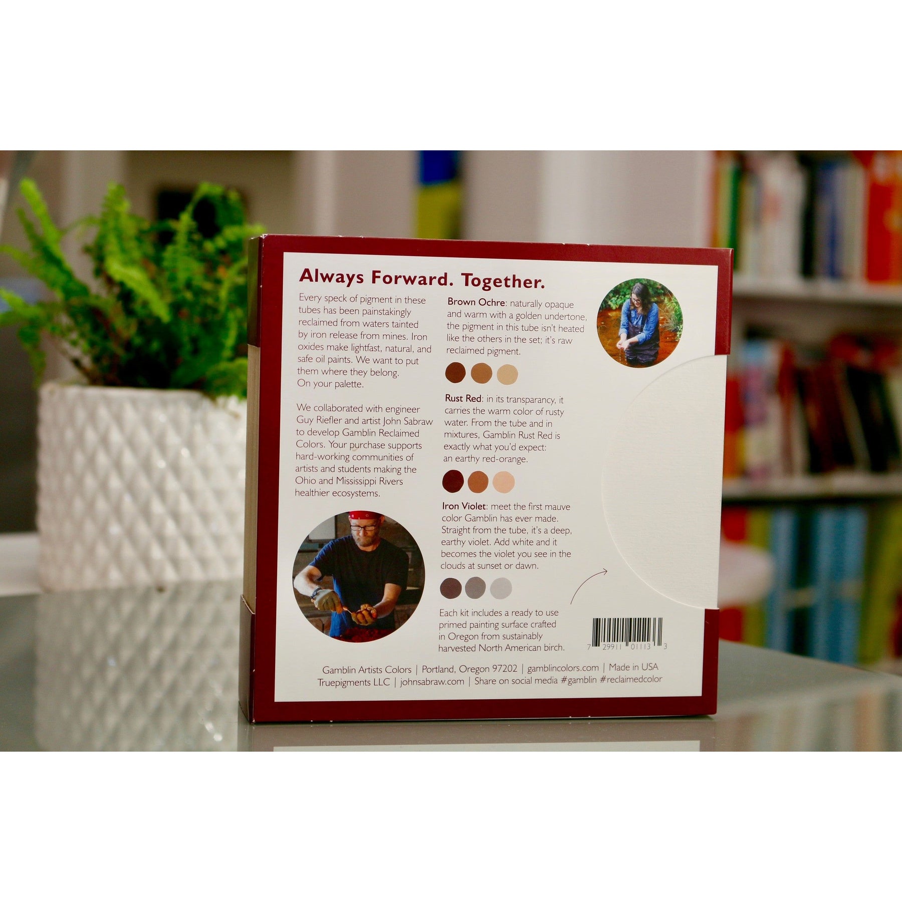 Gamblin is committed to reducing the use of plastic and unnecessary packaging wherever they can. They designed this set without plastic shrink-wrap. The sleeve and insert are recyclable, and the structure of the packaging has a function; it’s a primed panel made in Oregon by their friends at American Easel. It’s the ideal painting surface made with U.S.-grown poplar sides and a Baltic birch face.
