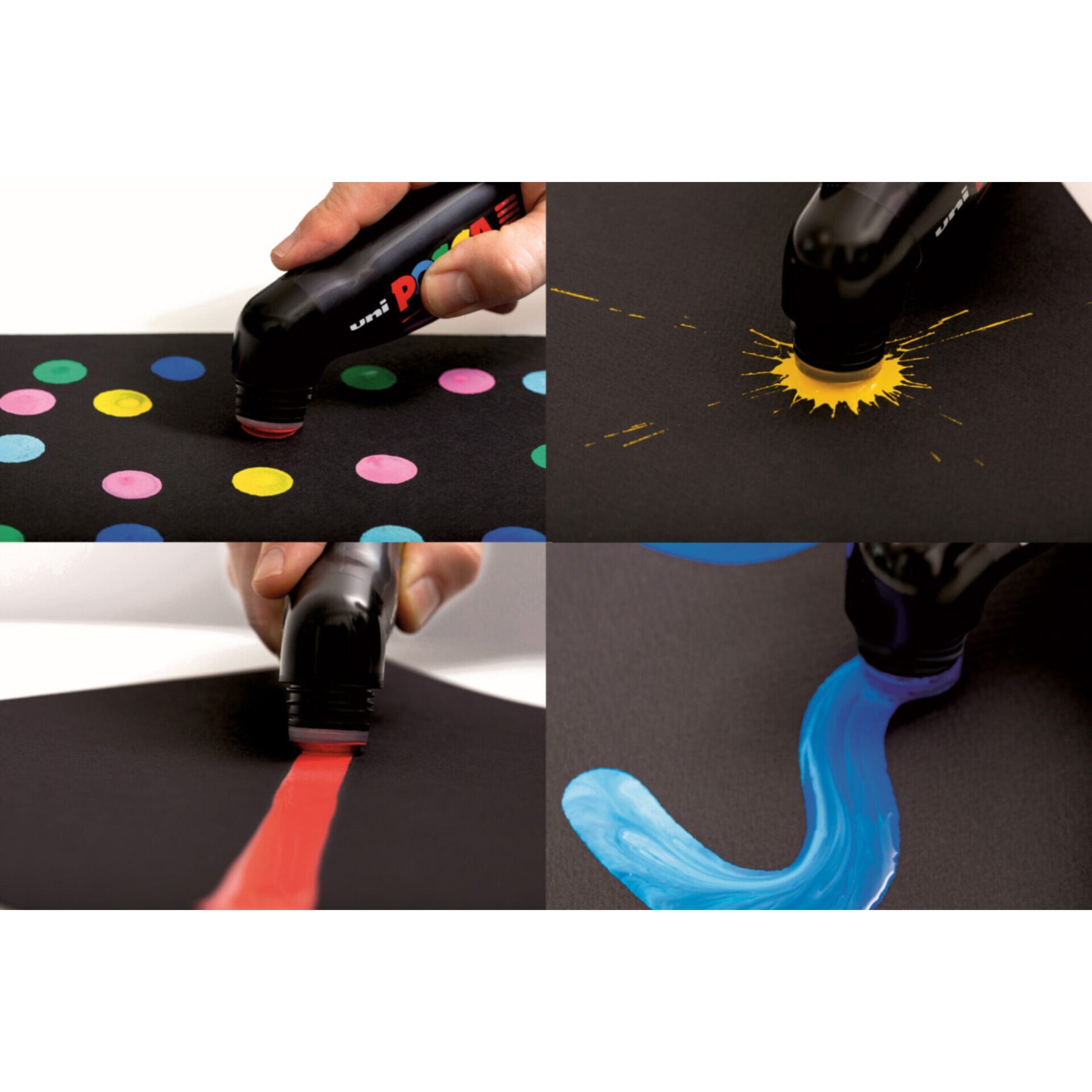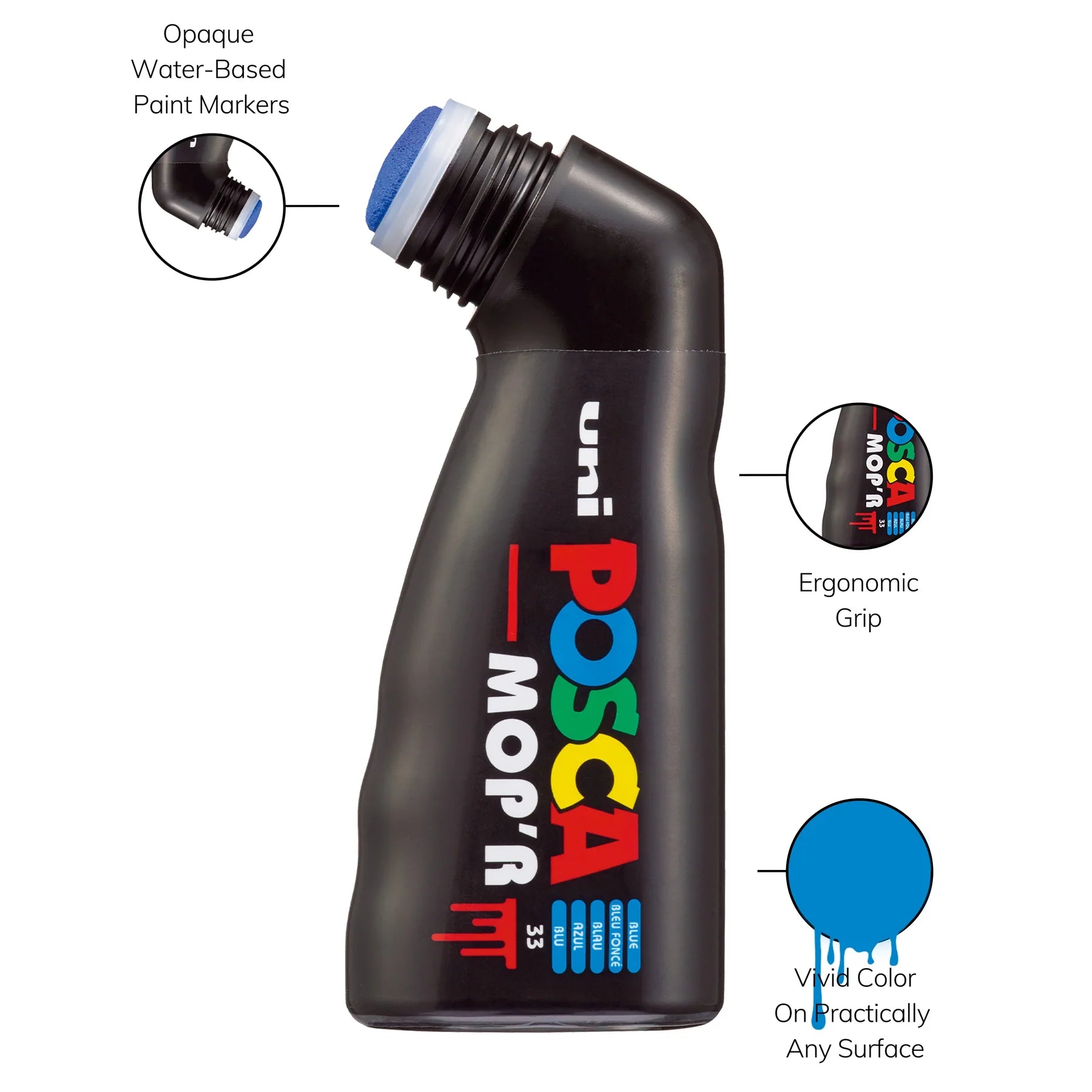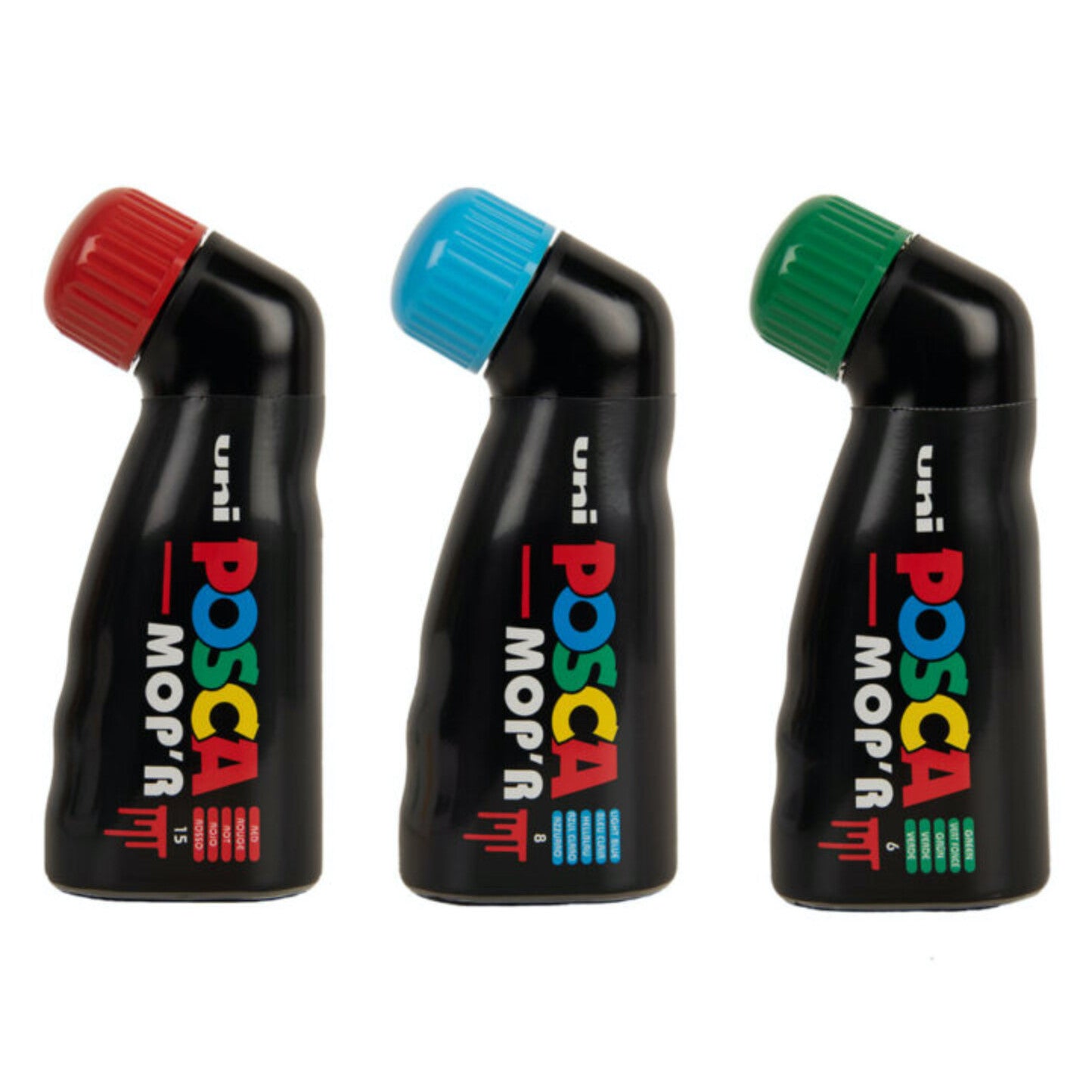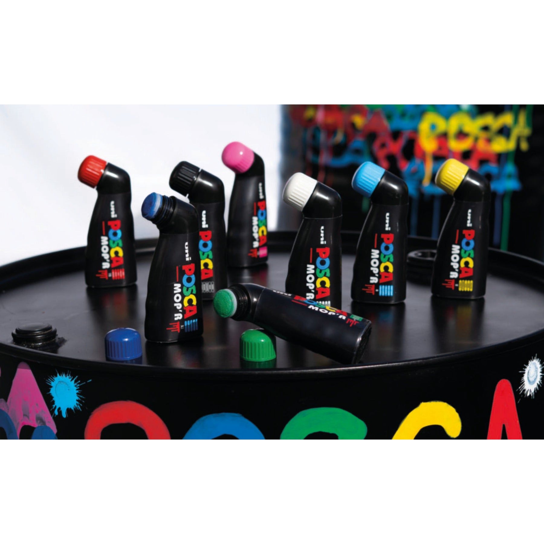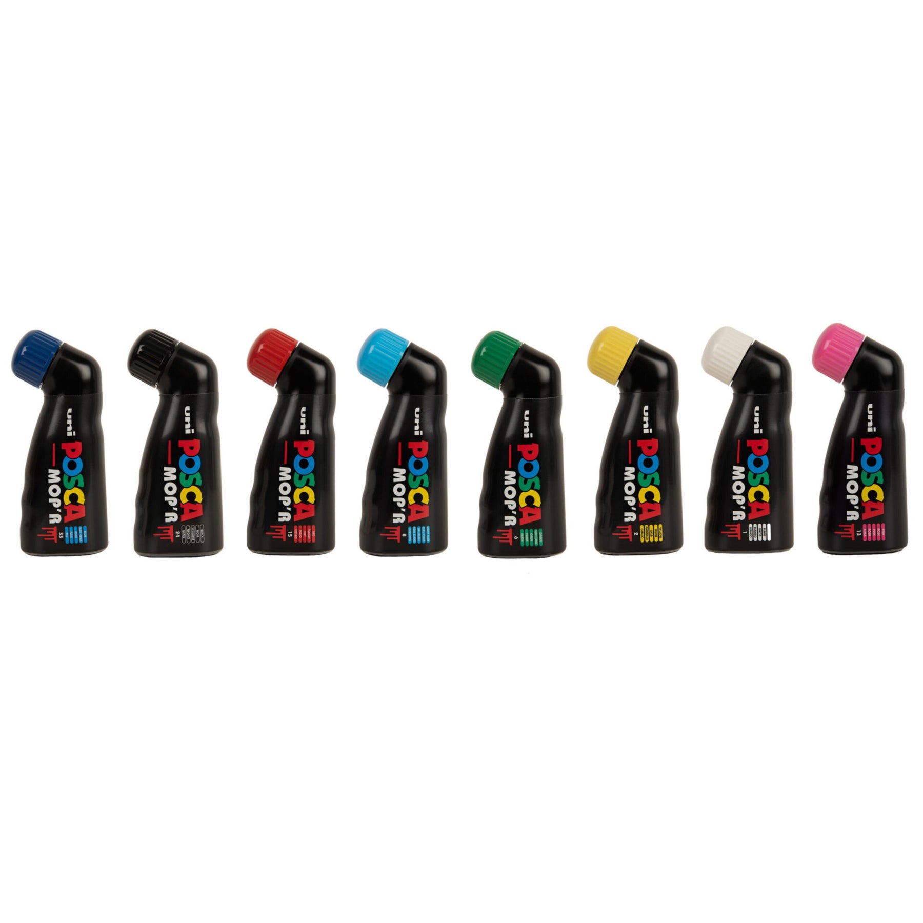 POSCA MOP'R features a round foam rubber tip and innovative barrel design for a generous application of color. With its truly ergonomic shape and semi-rigid design, it offers a new grip and a unique artistic experience. Create large drawings horizontally or vertically with the MOP'R. It can be used right side up for finer details or upside down for high link flow. Use MOP'R to create an endless variety of effects that are harder to achieve with other tips. It's perfect for creating splashes, stamps, spray effects, drips, highlights and more. Like all POSCA markers, MOP'R paint is non-toxic, water-based, mixable and colors can be over layered. Lines between 3 and 19mm can be achieved depending on the angle of the tip.
