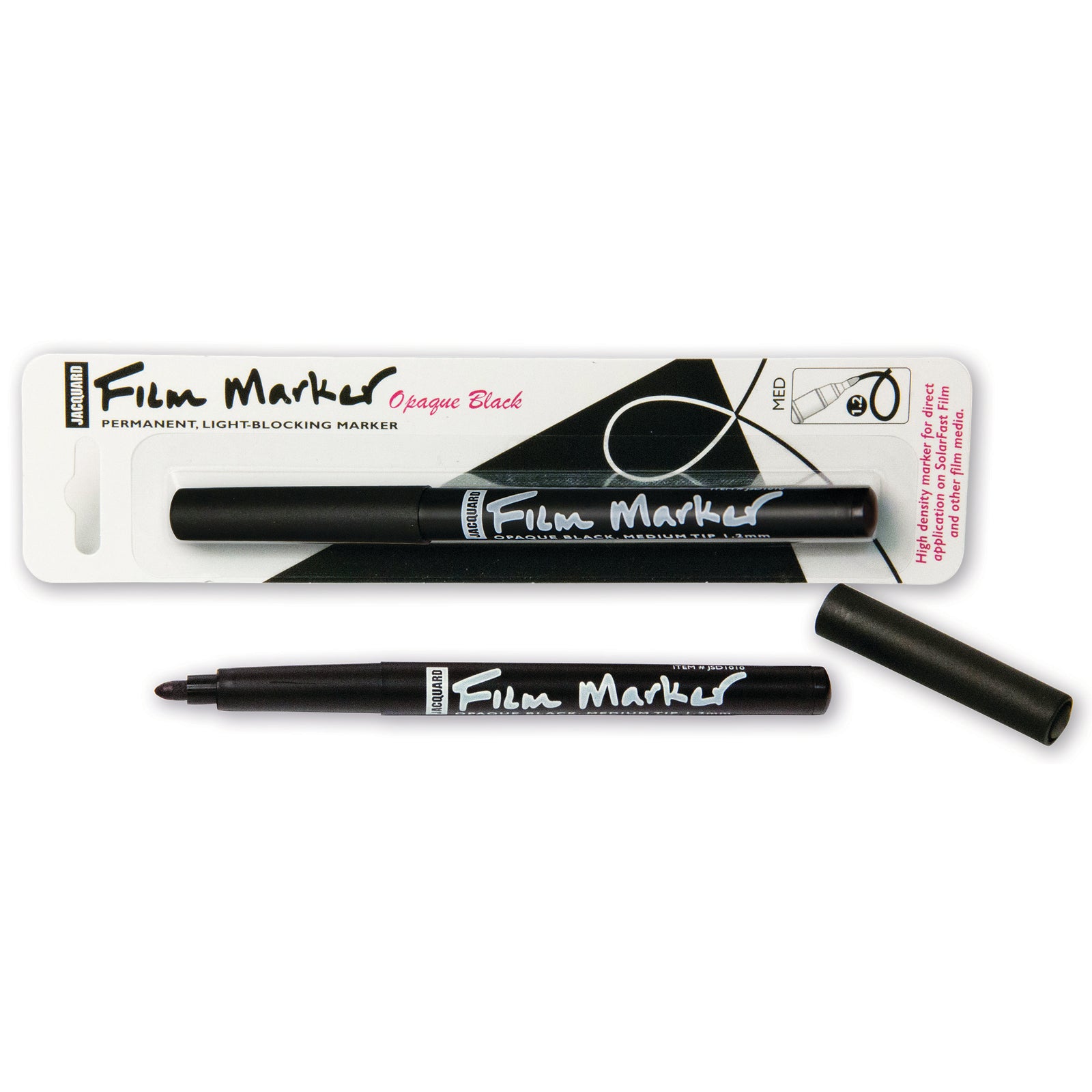 Jacquard Film Marker is a high density permanent marker, perfect for creating hand drawn film negatives on SolarFast Film for use with SolarFast Dyes or other photographic media. Also great for creating hand-drawn film positives. Use film positives to burn stencils for screen printing with Jacquard Screen Printing Inks.